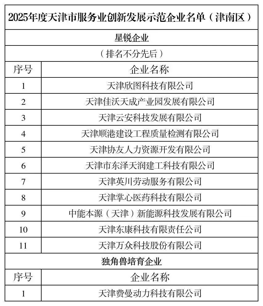 近日,天津市发展和改革委员会公布了2025年度“天津市服务业创新发展示范企业梯度培育名单”,津南区12家企业上榜,其中11家企业入选星锐企业名单,1家企业入选独角兽培育企业名单。截至目前,全区共有34家服务业创新发展示范企业。